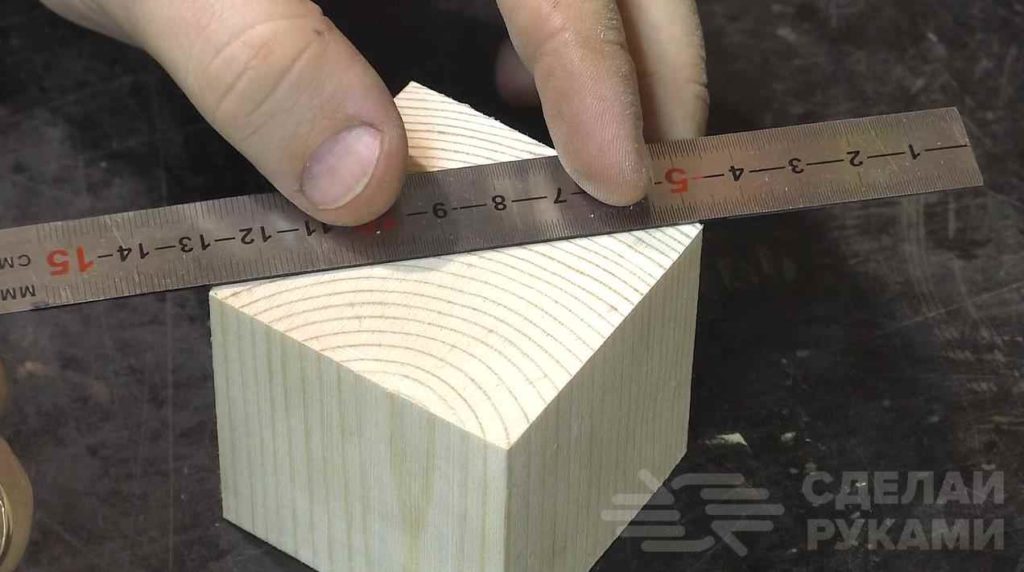 На следующем этапе автор делает разметку на всех сторонах деревянного кубика, и отмечает центр на каждой из сторон.