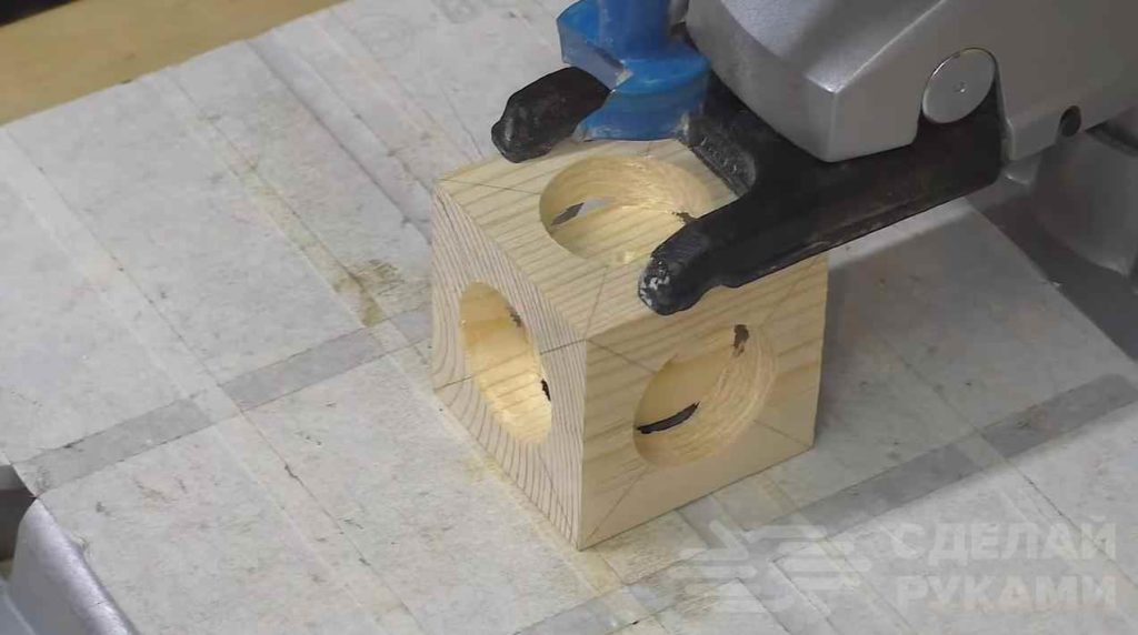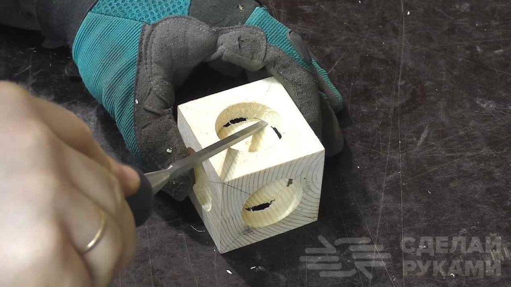 Далее просверливаем отверстия в каждой стороне кубика при помощи фрезы. После этого автор берет стамеску и прорезает оставшиеся стенки, чтобы внутренний кубик мог отделиться от наружного.