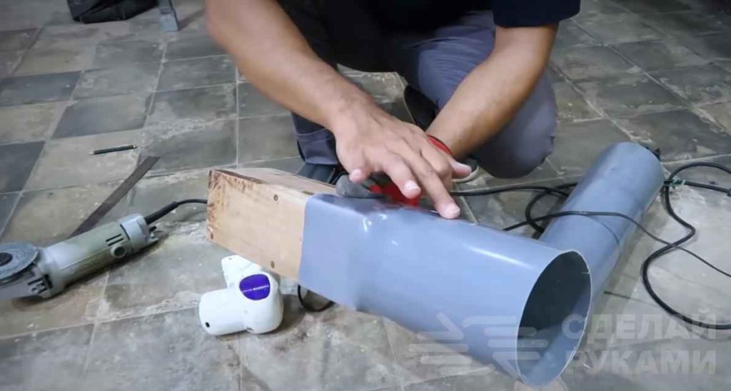 Отрезок пластиковой трубы нагреваем феном и аккуратно надеваем на квадратный короб из досок (можно сделать также из кусков фанеры). Половинку трубы также нагреваем феном и придаем заготовке форму листа.