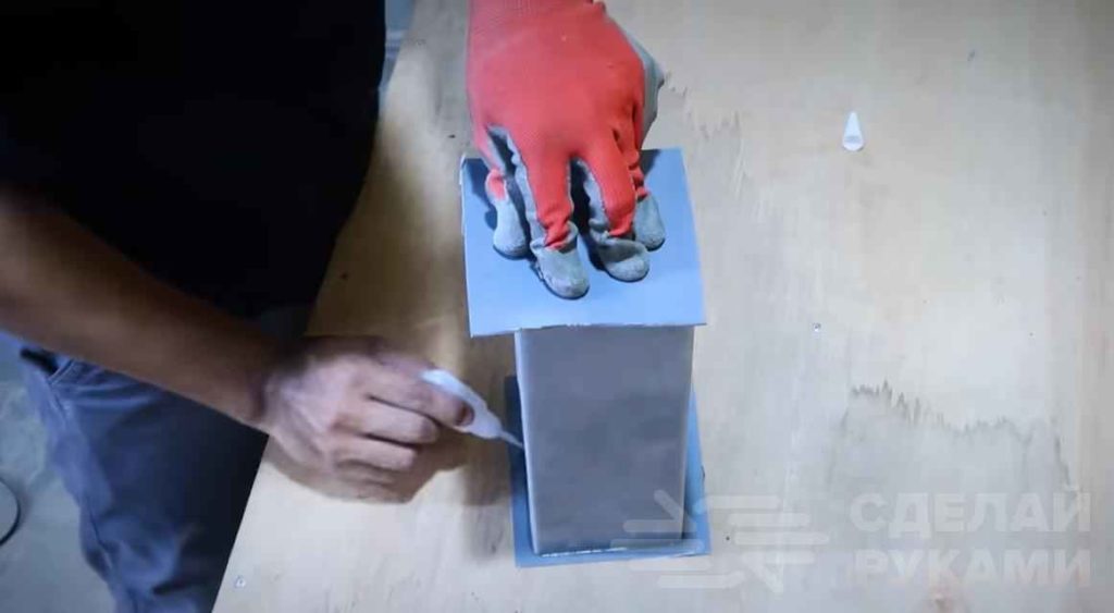На следующем этапе из листа пластика необходимо будет отрезать две заглушки квадратной формы, и приклеиваем их к пластиковой трубе.