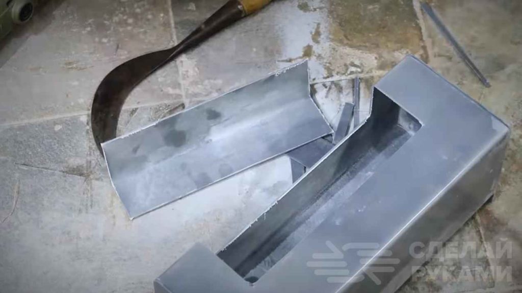 Далее делаем разметку и вырезаем кусок в виде уголка из центральной части квадратной трубы. Отрезаем полосу из листа пластика.