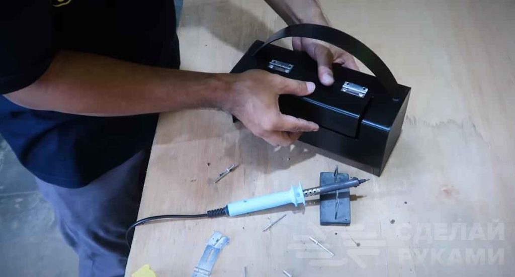 С помощью заклепок и петель крепим крышку шкатулки. Потом устанавливаем защелку или «уши» для навесного замка.