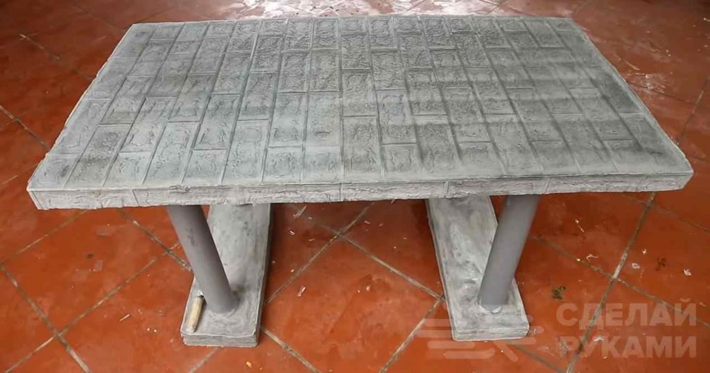 Когда столешница и ножки будут достаточно твердыми, разбираем опалубку. Выставляем ножки на нужно расстоянии друг от друга, сверху укладываем столешницу.