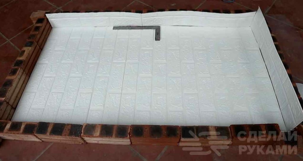 По периметру устанавливаем опалубку из кирпича (или можно из другого материала), и тоже обклеиваем обоями.