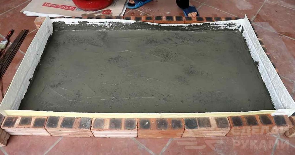 На следующем этапе готовим жидкий цементный раствор, заливаем в опалубку первый слой. Затем замешиваем более густой раствор, и также укладываем его в опалубку.
