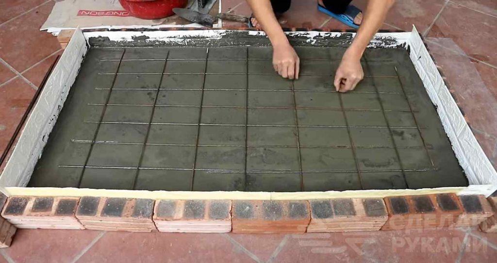 Утапливаем в раствор металлическую армирующую сетку, укладываем последний слой цементного раствора и выравниваем его.