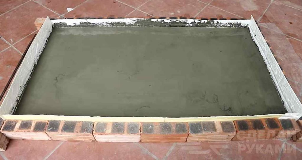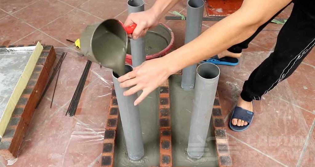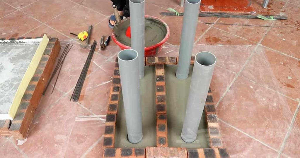 Из кирпичей делаем еще одну опалубку и заливаем основание ножек стола. Сами ножки будут из отрезков канализационной пластиковой трубы — выставляем их по уровню и заполняем раствором.