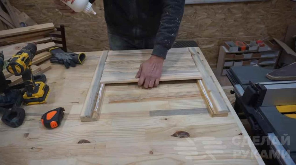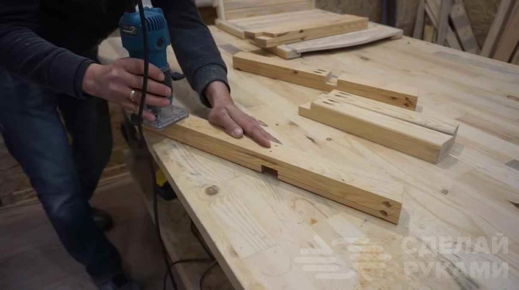 На следующем этапе мастер склеивает оставшиеся заготовки в бруски. Строгаем их и отпиливаем по размеру. Выбираем в них пазы.