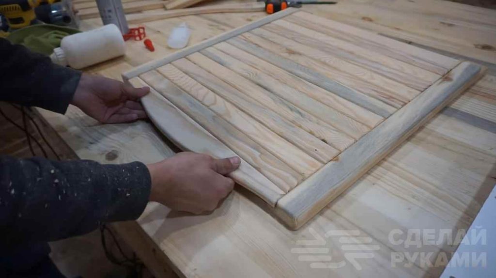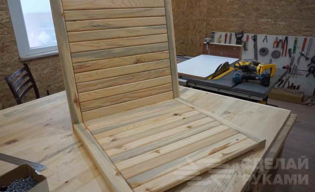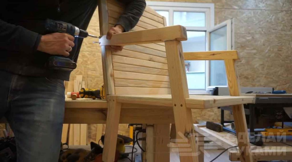 Далее автор приступает к изготовлению спинки стула. Сначала делаем две боковые части, потом — крепим между ними рейки. К верхней части автор крепит фигурную декоративную планку.