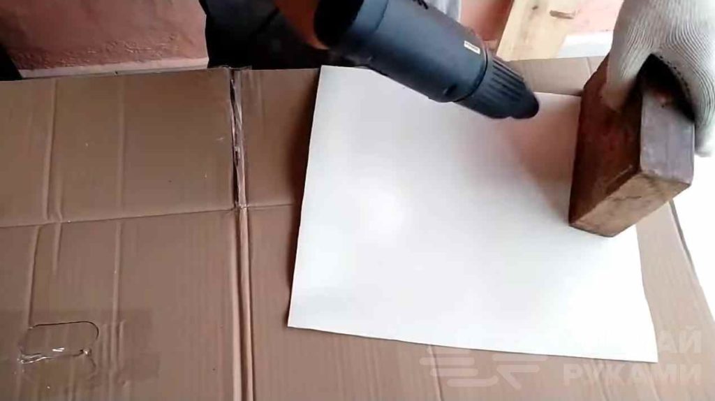 Далее нагреваем трубу строительным феном и с помощью деревянного бруска прижимаем ее к какой-либо твердой поверхности. Таким образом, получаем ровный лист.