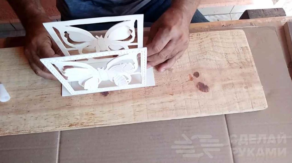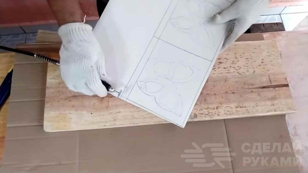 На следующем этапе берем бумажный шаблон и при помощи копировальной бумаги переносим орнамент на кусок пластика. После этого вырезаем дремелем. В итоге получаем две стенки салфетницы.