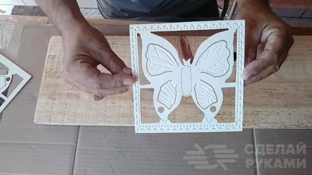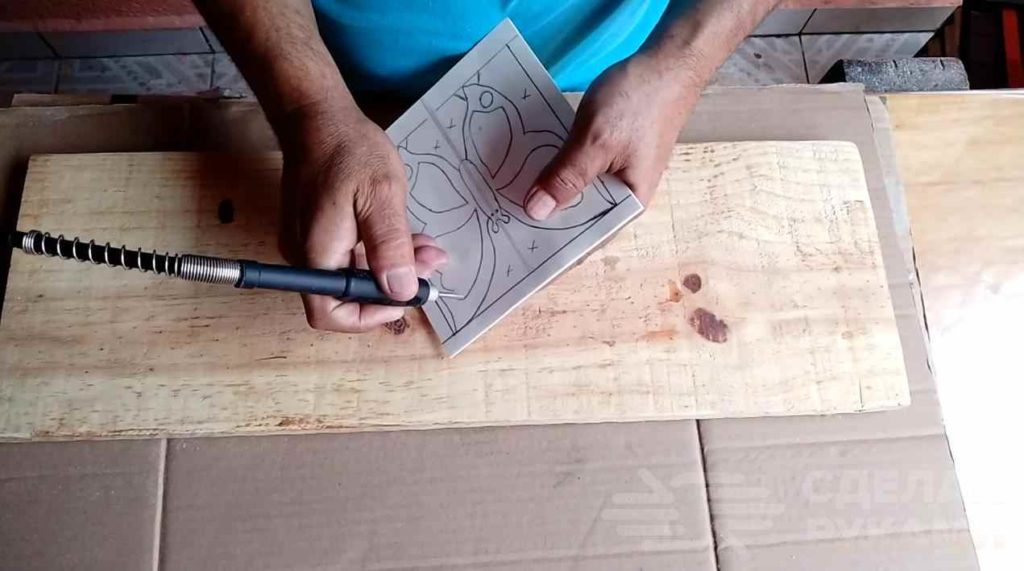 Для работы также потребуется дремель, строительный фен и бумажный шаблон с каким-либо орнаментом. В данном случае автор выбрал орнамент бабочки.