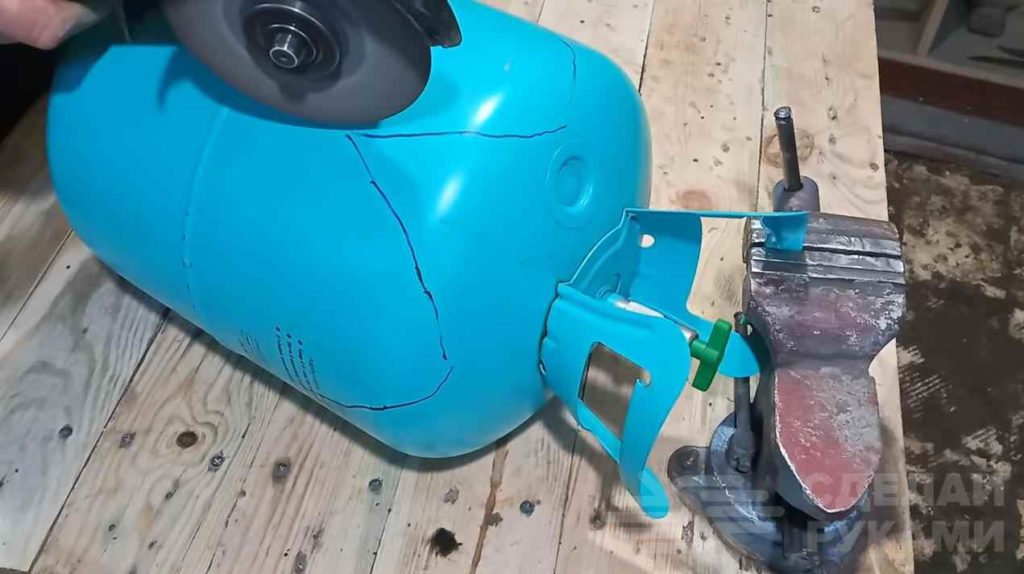 В первую очередь делаем разметку и отрезаем болгаркой верхнюю часть баллона таким образом, чтобы получились лепестки.