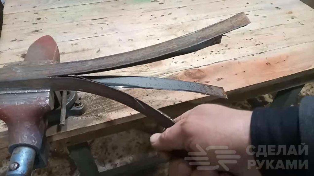 Делаем пропилы в нижней части стойки и загибаем стенки в разные стороны. Устанавливаем стойку на крестовину, и обвариваем. Сварные швы зачищаем болгаркой.