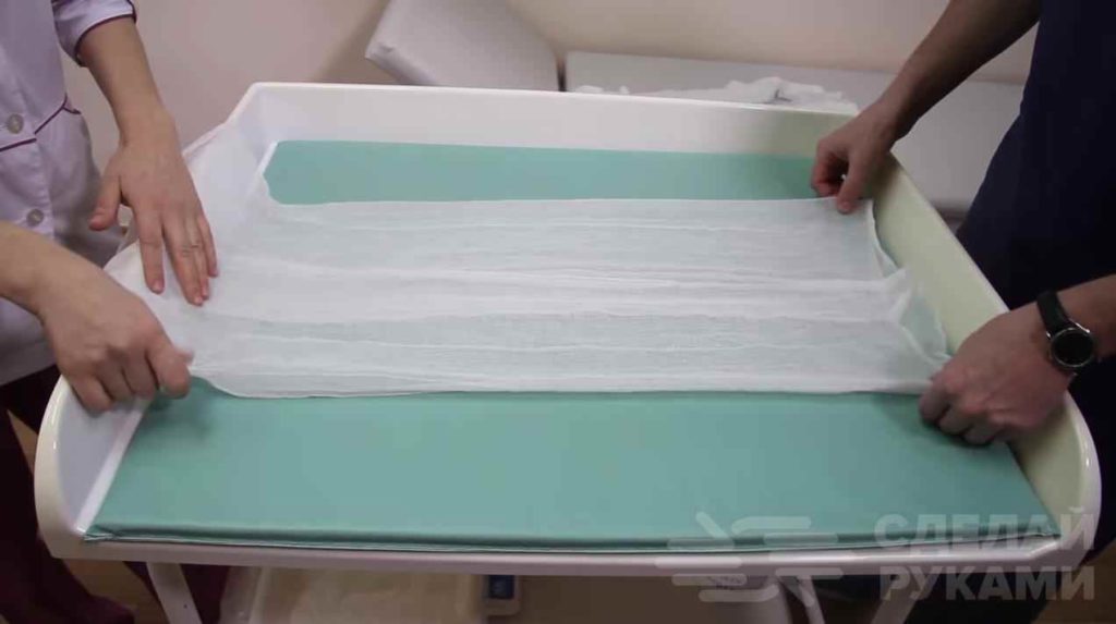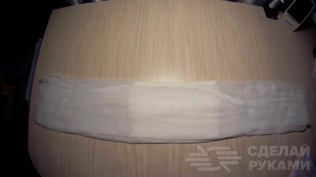 Можно поступить немного проще. Отрезаем кусок марли необходимого размера. Укладываем его на стол или другую ровную поверхность.