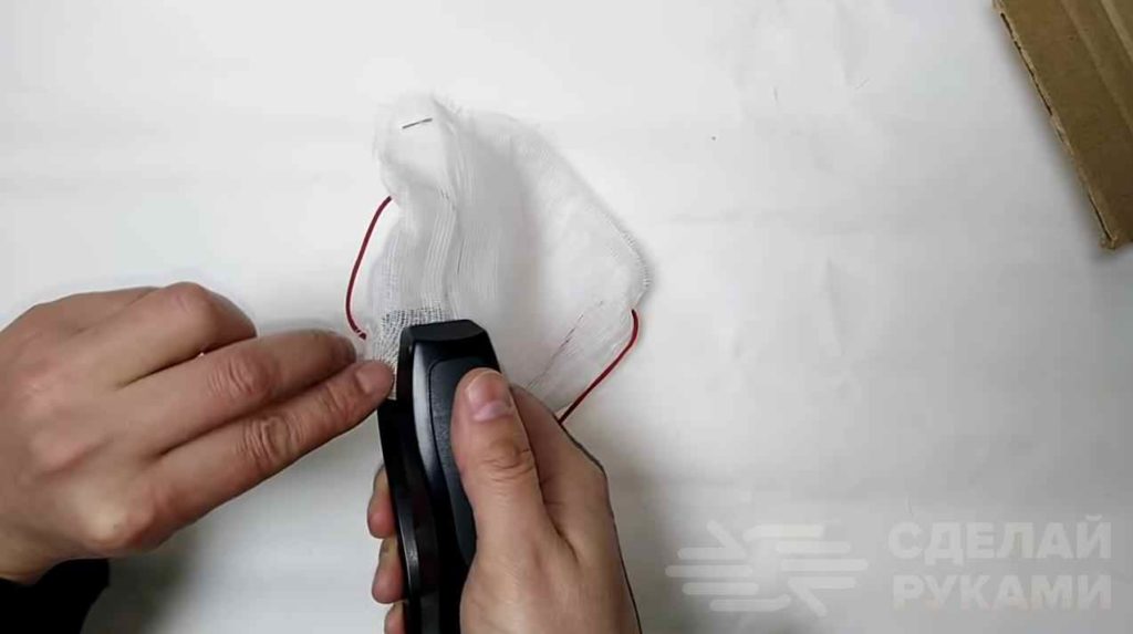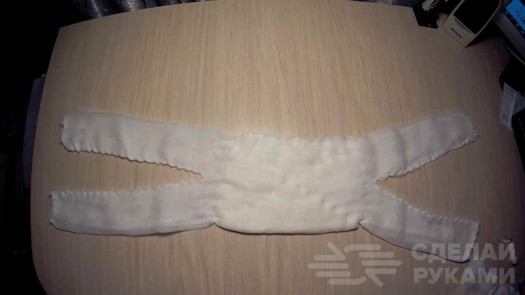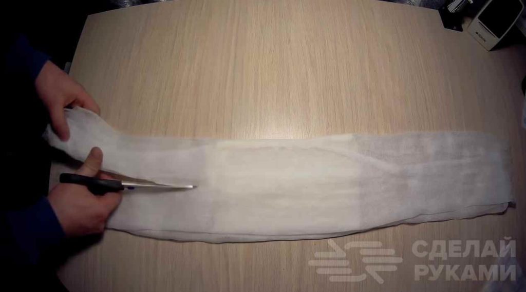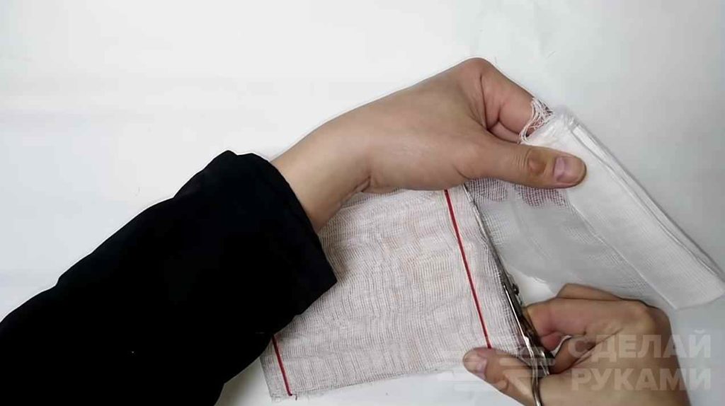 Чтобы сформировать завязки (а они обязательно должны быть), края марлевого отреза необходимо аккуратно разрезать ножницами практически до самой ваты.