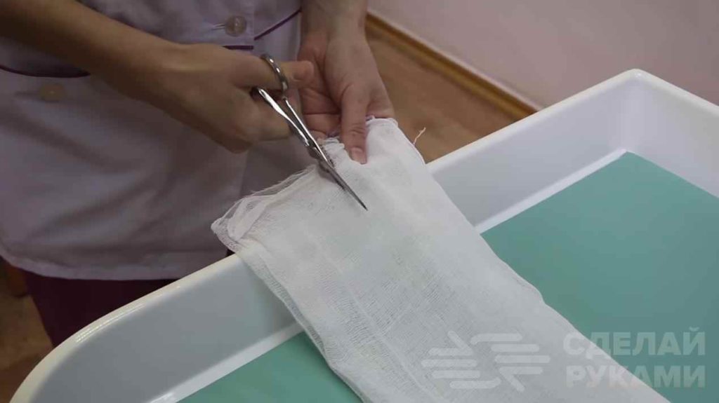 Далее складываем повязку в продольном направлении пополам. После этого берем ножницы и разрезаем марлю в продольном направлении, оставляя по центру квадрат.