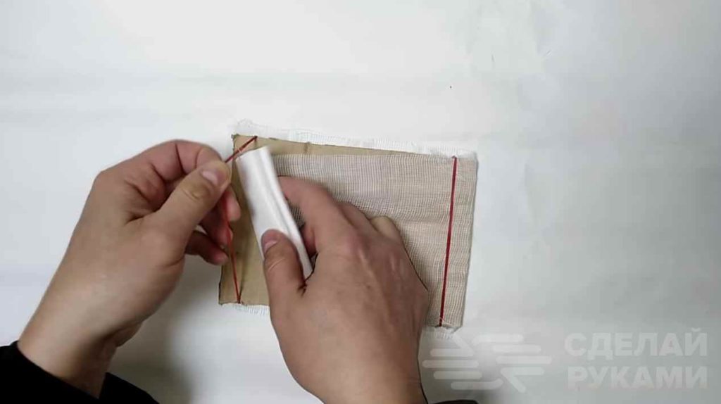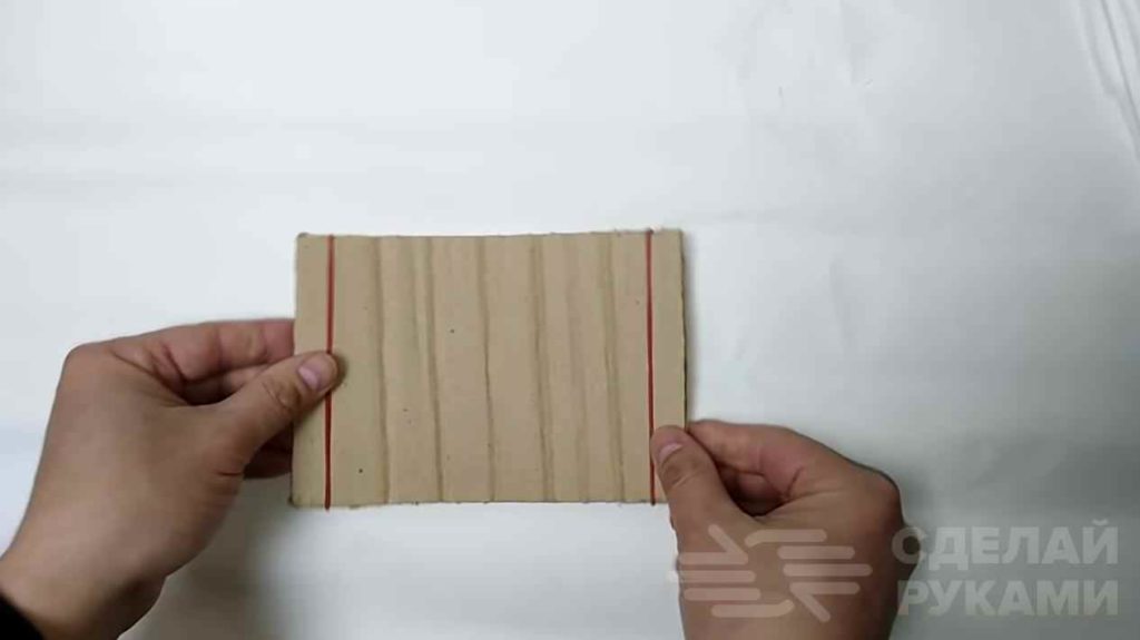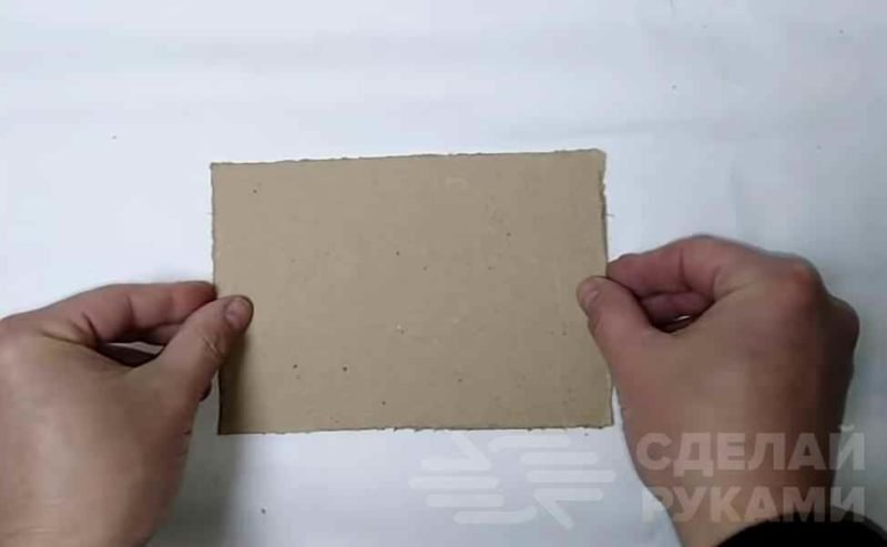 Первым делом из куска картона необходимо будет вырезать прямоугольник с размерами 13х17 см. По краям картона надеваем две резинки.