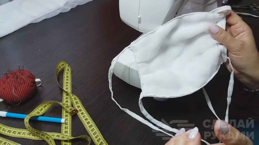 Далее вооружаемся иголкой и белой ниткой. Прошиваем участок вокруг ваты и сами завязки. Марлевая повязка своими руками готова. Срок действия маски — не более 3-4 часов.