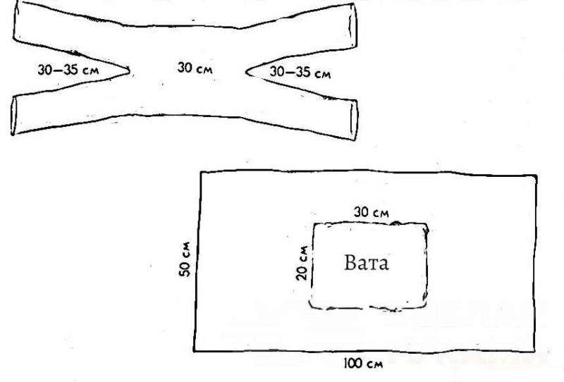 Теперь несколько слова касательно размеров повязки. Начнем, пожалуй, с марли — отрезаем кусок размером 50х100 см. Размер слоя ваты должен быть примерно 20х20 см.