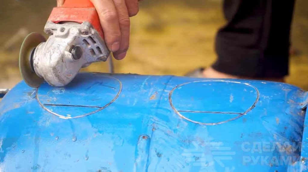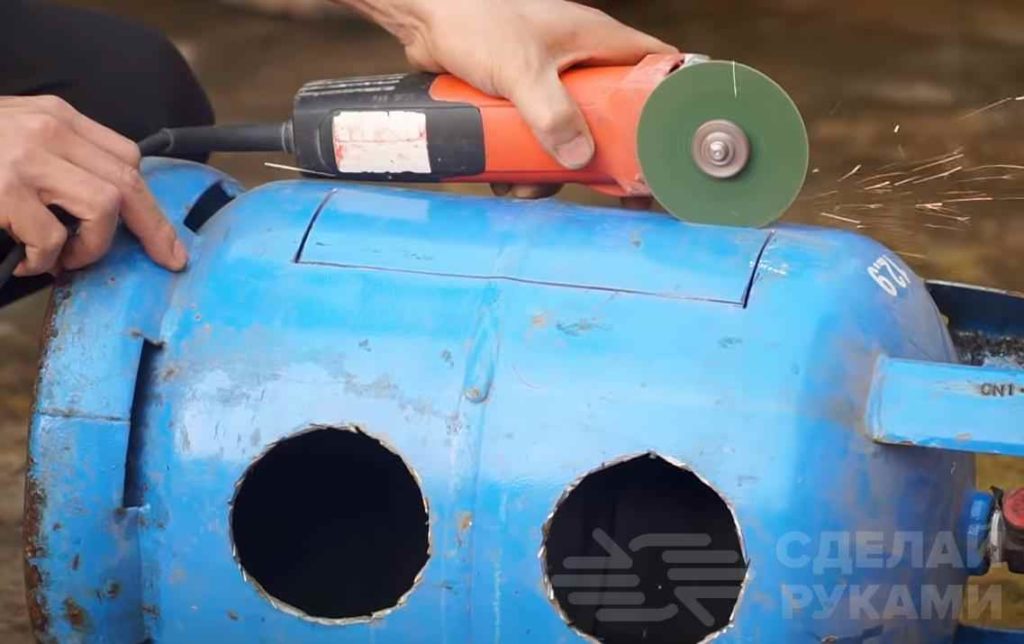 Первым делом откручиваем вентиль, и заполняем баллон водой (это обязательная мера предосторожности!). Затем болгаркой автор вырезает два отверстия.