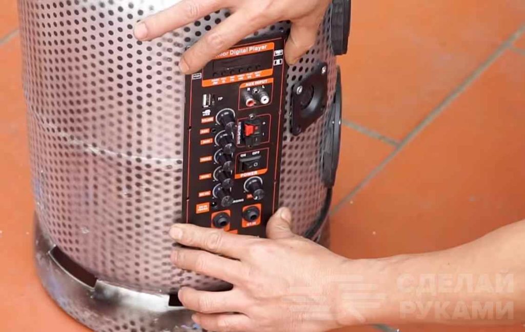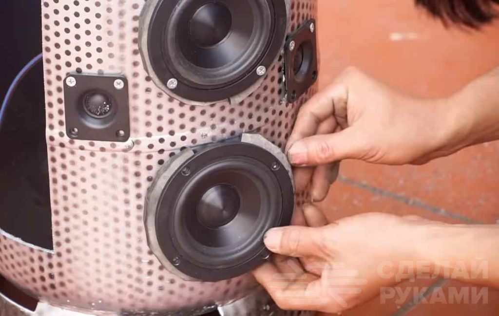 В большие круглые отверстия устанавливаем динамики полного диапазона на 50 W. Также крепим их к корпусу саморезами. Дополнительно между корпусом и динамиком автор устанавливает мягкую прокладку.