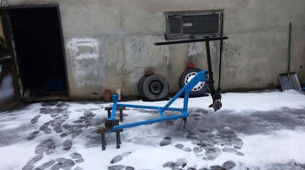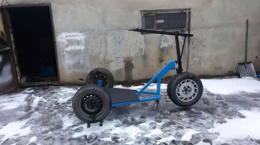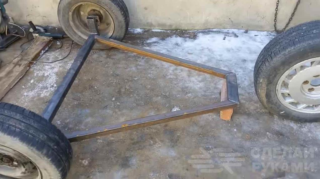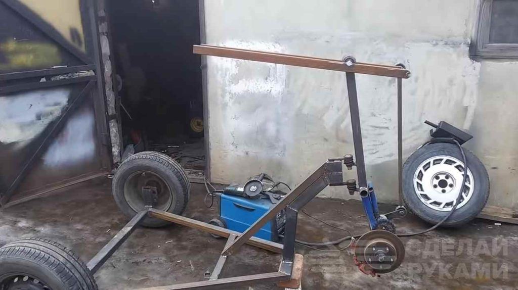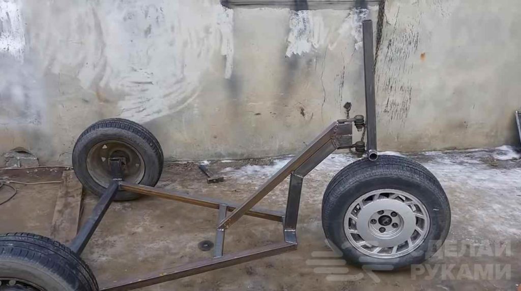 Задняя часть рамы — это колесная ось, по бокам которой крепятся ступицы. К ним прикручиваем колеса от авто.