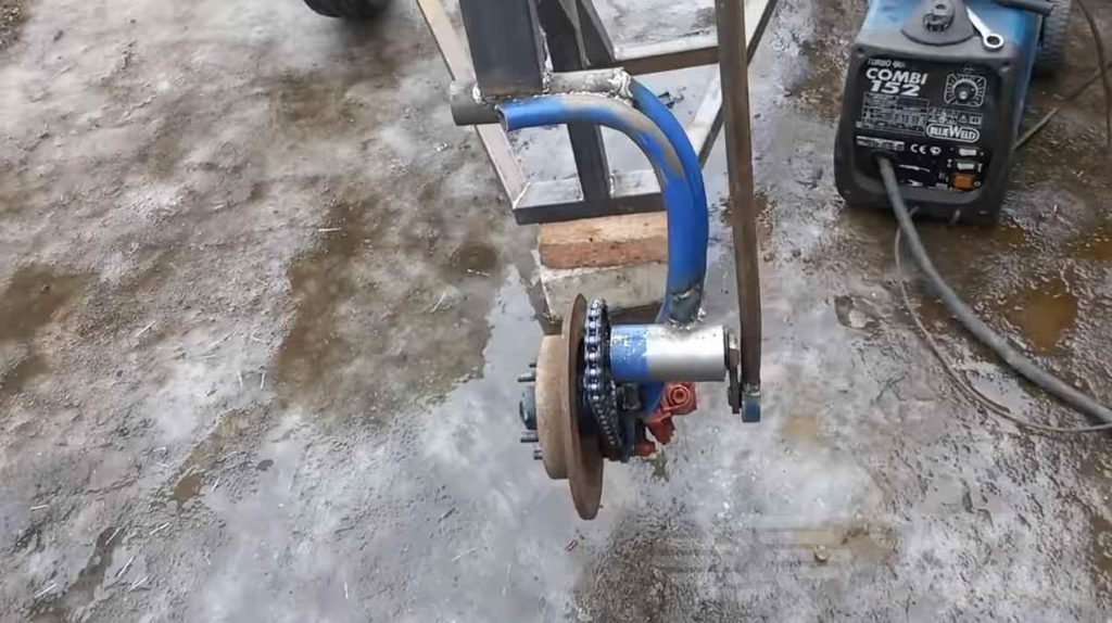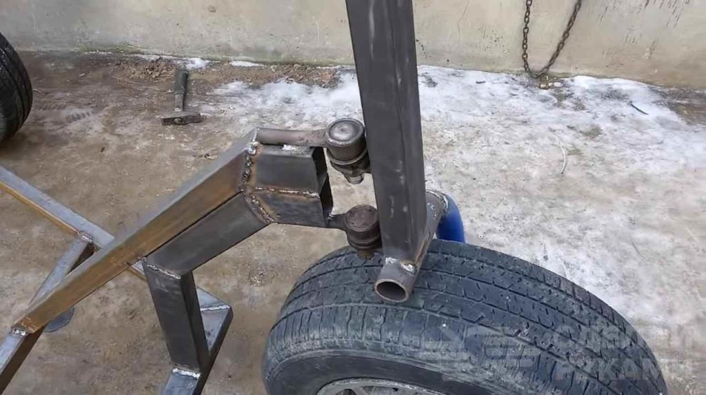 После этого к раме нужно будет приварить крепление для переднего колеса с рулевой стойкой. К нижней части устанавливаем ступицу, к которой будет крепиться колесо.