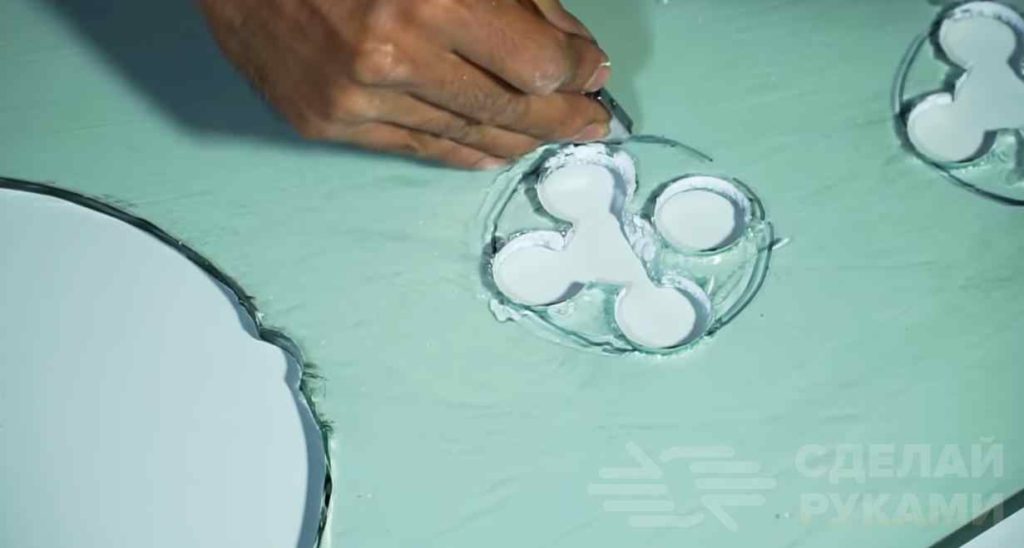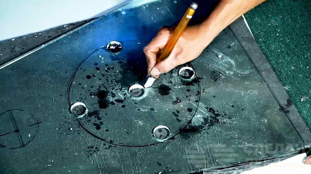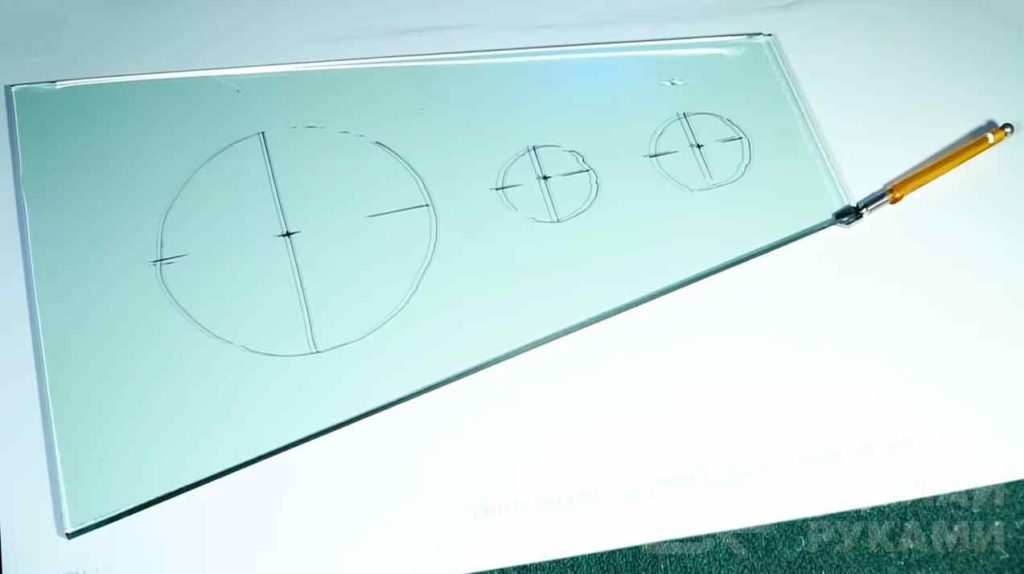 Прорезаем стеклорезом наружный контур, после чего вырезаем все лишнее внутри самой окружности. Аналогичным образом поступаем и с маленькими отверстиями — под высокочастотные динамики.