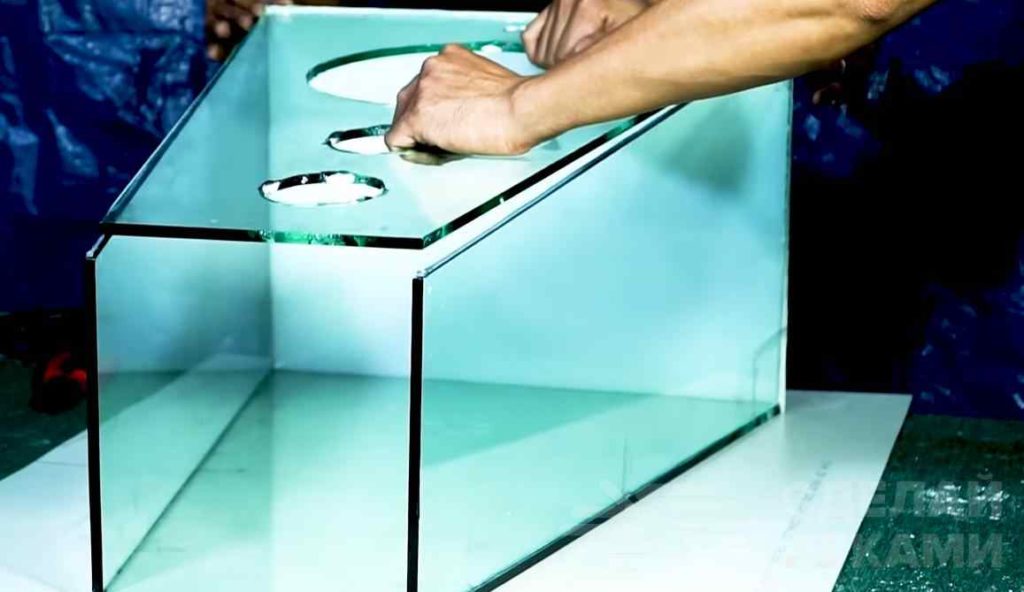 На следующем этапе с помощью герметика соединяем вместе две боковых и переднюю стенки, и фиксируем их на основании.
