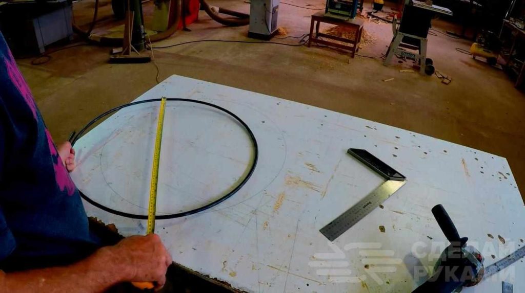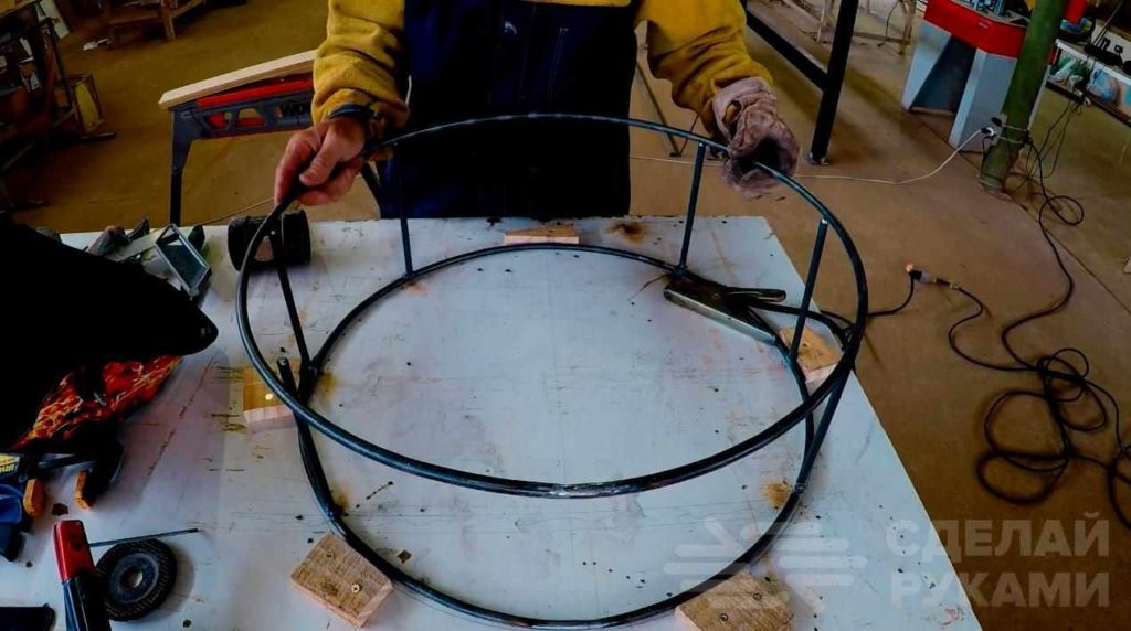 Первым делом отрезаем две заготовки из круглого прутка, после чего на гибочном станке придаем им форму колец (диаметр — на ваше усмотрение). Концы колец соединяем вместе и свариваем.