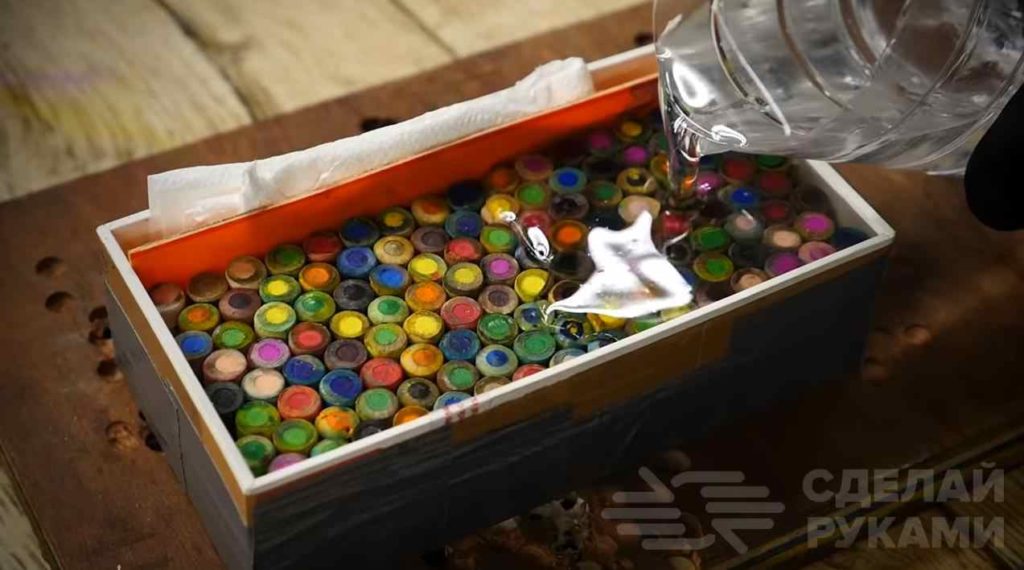 На следующем этапе автор делает из кусков пластика коробочку, и укладывает в нее «огрызки» карандашей, установив их вертикально. А потом заливаем форму прозрачной эпоксидной смолой.