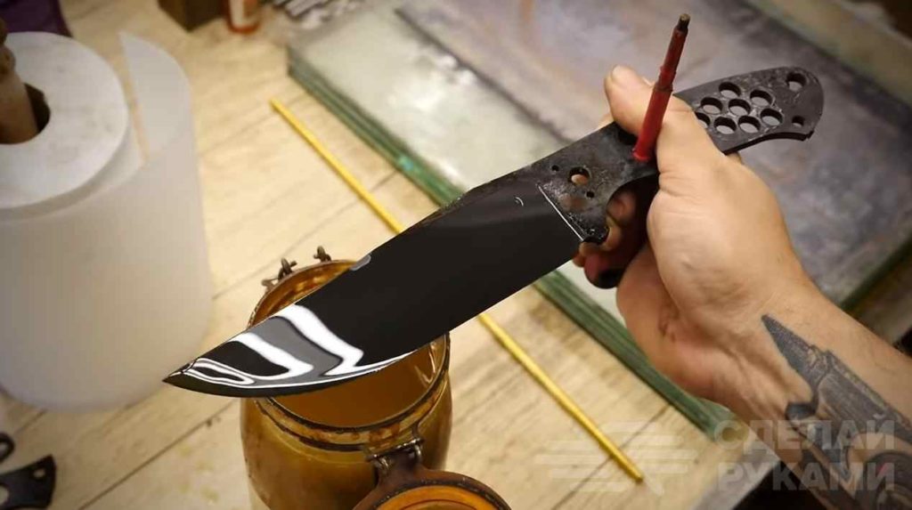 Потом следует отпуск металла и заточка лезвия. При желании можно обработать нож в хлорном железе.