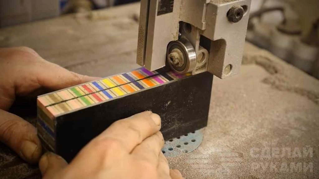После того, как эпоксидная смола застыла, отрезаем все лишнее, придавая нашей заготовке прямоугольную форму, и распиливаем ее вдоль пополам.