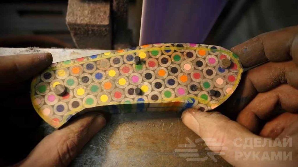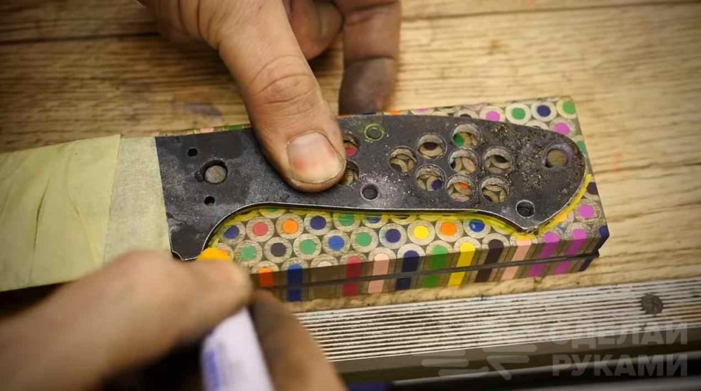 В данном обзоре мастер делится интересной идеей, как своими руками сделать необычную ручку для ножа. Для этого потребуются цветные карандаши, а также эпоксидная смола.