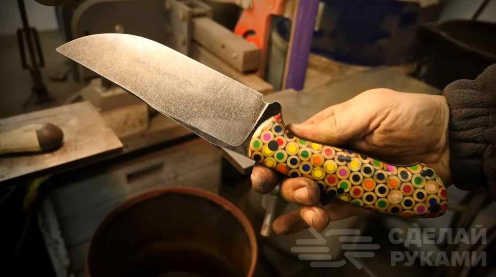 На последнем этапе останется только закрепить накладки на ручке ножа, после чего обрабатываем их и покрываем слоем эпоксидной смолы. Необычная самодельная ручка готова.