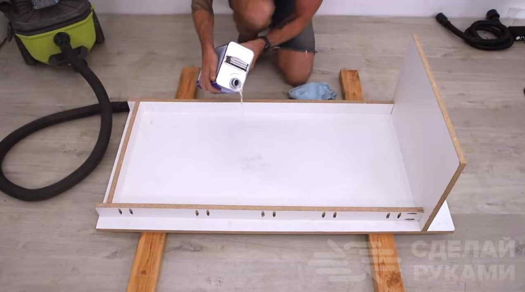 Первым делом необходимо будет сделать опалубку для заливки бетонной смеси. Мастер использует для этого листы ДСП. Внутреннюю поверхность нужно смазать маслом.