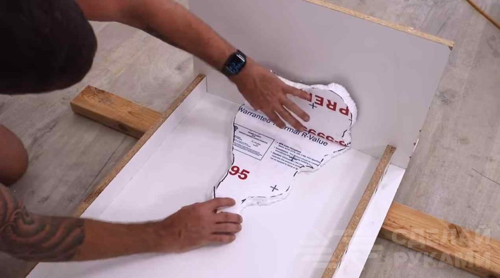 Также автор вырезает два куска пенопласта произвольной формы и приклеивает с помощью герметика к внутренней стороне опалубки.