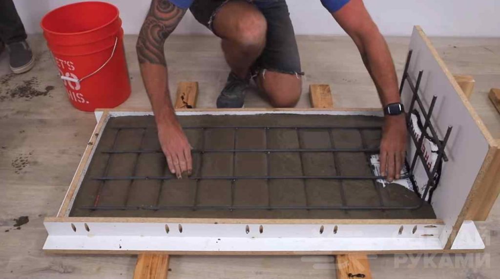 На следующем этапе необходимо будет приготовить бетонную смесь, и заливаем опалубку. Укладываем арматурный каркас и фиксируем его, чтобы он погружался в раствор.
