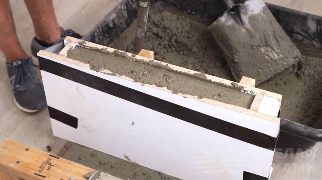 Потом устанавливаем вторую часть опалубки и заливаем ее бетоном. В процессе заливки бетонную смесь нужно обязательно утрамбовывать, постукивая киянкой или молотком по стенкам опалубки.