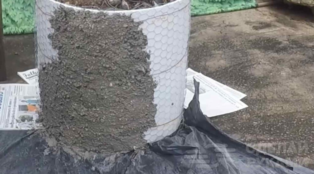 Далее из цемента и пенопласта автор замешивает раствор. Наносим его на сетку, как штукатурку. Добиваемся, чтобы слой был равномерным.