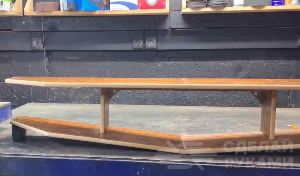 На тыльной стороне конструкции прикручиваем металлические уголки, чтобы можно было закрепить полку к стене. Подробный процесс работ смотрите на видео ниже.