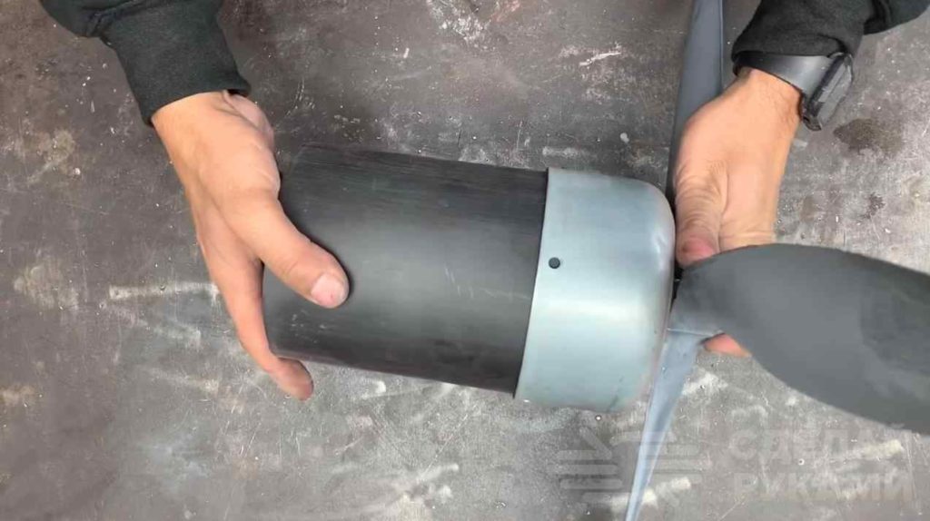 На следующем этапе автор отрезает кусок пластиковой трубы подходящего диаметра и надевает на него часть корпуса от электродвигателя. К нему крепим винт (можно снять со старого вентилятора).