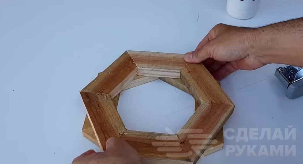 Далее из напиленных заготовок необходимо будет склеить шестиугольники. Попарно склеиваем подготовленные шестиугольники так, как показано на фото ниже.