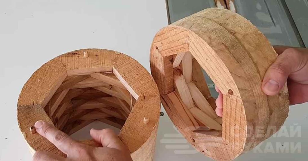 Склеиваем получившиеся кольца, чтобы получился цилиндр необходимой высоты. Последние два кольца, склеенные друг с другом, крепим на шканты.