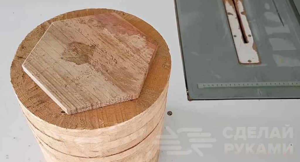 Далее делаем шестиугольные дно и крышку. Крепим их к цилиндру снизу и сверху. Перед этим автор обтачивает цилиндрическую заготовку на токарном станке.