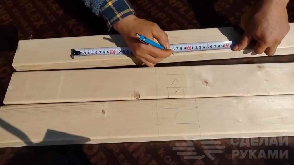 Первым делом необходимо будет отпилить три доски одинаковой длины. Строгаем и шлифуем их, после чего автор делает разметку.