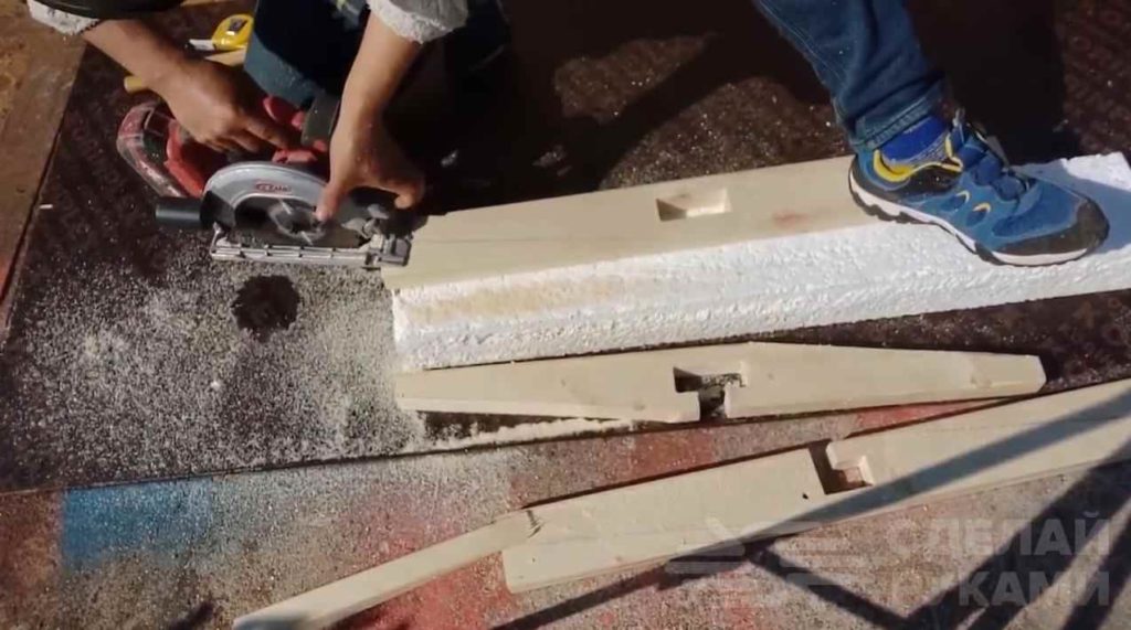 Затем автор делает разметку и отпиливает часть заготовок под углом с помощью ручной циркулярной пилы.
