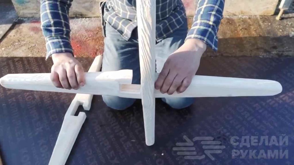 Все три ножки стола соединяются друг с другом на «замок», и каждая из них перпендикулярна другой.
