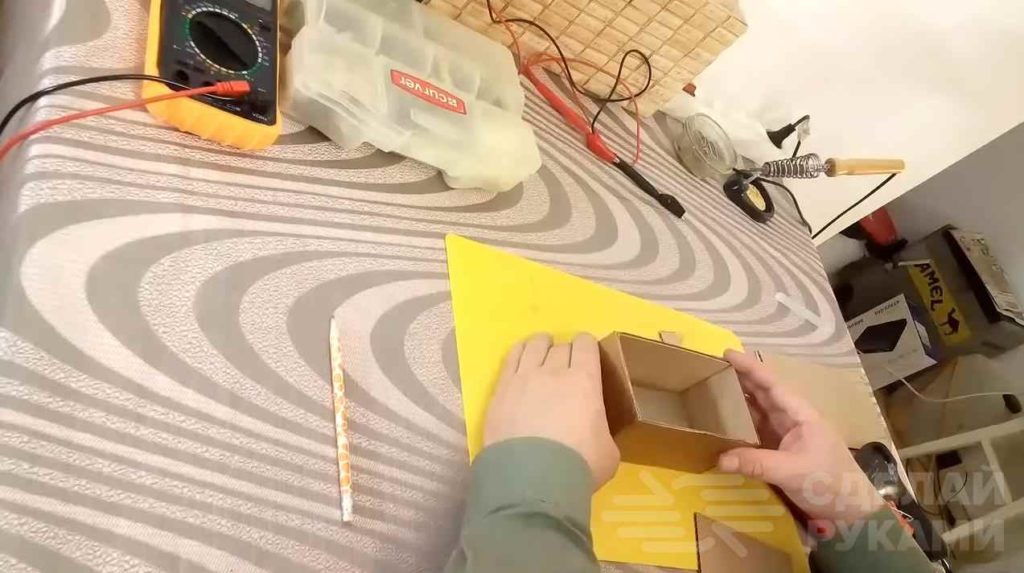 Приступаем к изготовлению нашей самоделки. Для начала вырезаем из картона подходящие размеры будущего ПНВ. Примеряем смартфон, и склеиваем в виде коробочки.